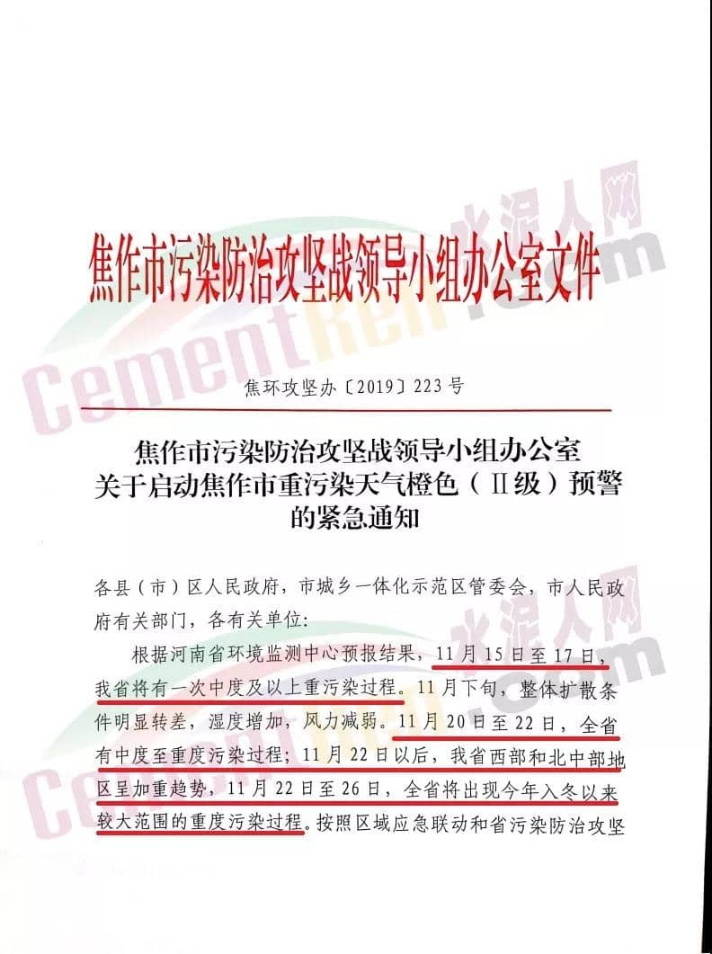 以許昌市為例,當(dāng)?shù)匚廴痉乐喂?jiān)戰(zhàn)領(lǐng)導(dǎo)小組通知 自11月19日0時(shí)啟動(dòng)重污染天氣橙色,實(shí)施II級(jí)應(yīng)急響應(yīng)措施。停產(chǎn)類企業(yè)包括水泥熟料企業(yè)(經(jīng)批準(zhǔn)協(xié)同處置,危廢、污泥等涉及民生的熟料生產(chǎn)線11月19日0時(shí)停產(chǎn)到位)、水泥粉磨企業(yè)、礦渣微粉企業(yè)、水泥制品企業(yè),商砼企業(yè)等。