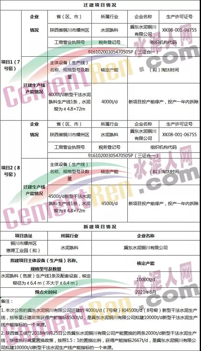經(jīng)審核,冀東水泥銅川有限公司4000t/d新型干法熟料水泥生產(chǎn)線和4500t/d新型干法熟料水泥生產(chǎn)線符合“因當?shù)匕l(fā)展規(guī)劃調(diào)整,導致不屬于國家明令淘汰的落后產(chǎn)能的生產(chǎn)裝置遷建的,且企業(yè)持有的生產(chǎn)許可證仍在有效期內(nèi),企業(yè)搬遷又未享受退出產(chǎn)能的資金獎補和政策支持,企業(yè)承諾確不新增產(chǎn)能”要求。公示原文如下: