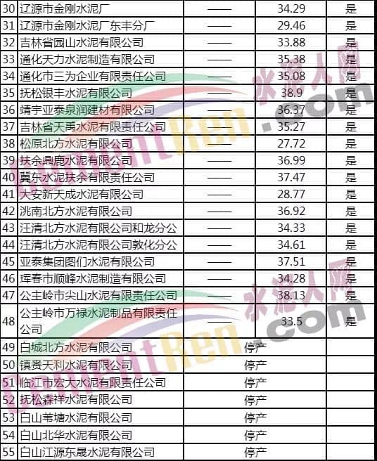 其中得知,55家水泥企業(yè)中,白城北方水泥有限公司、鎮(zhèn)賚天利水泥有限公司、臨江市宏大水泥有限責(zé)任公司、撫松森祥水泥有限公司、白山葦塘水泥有限公司、白山北華水泥有限公司、白山江源東晟水泥有限公司7家水泥企業(yè)處于停產(chǎn)狀態(tài)。