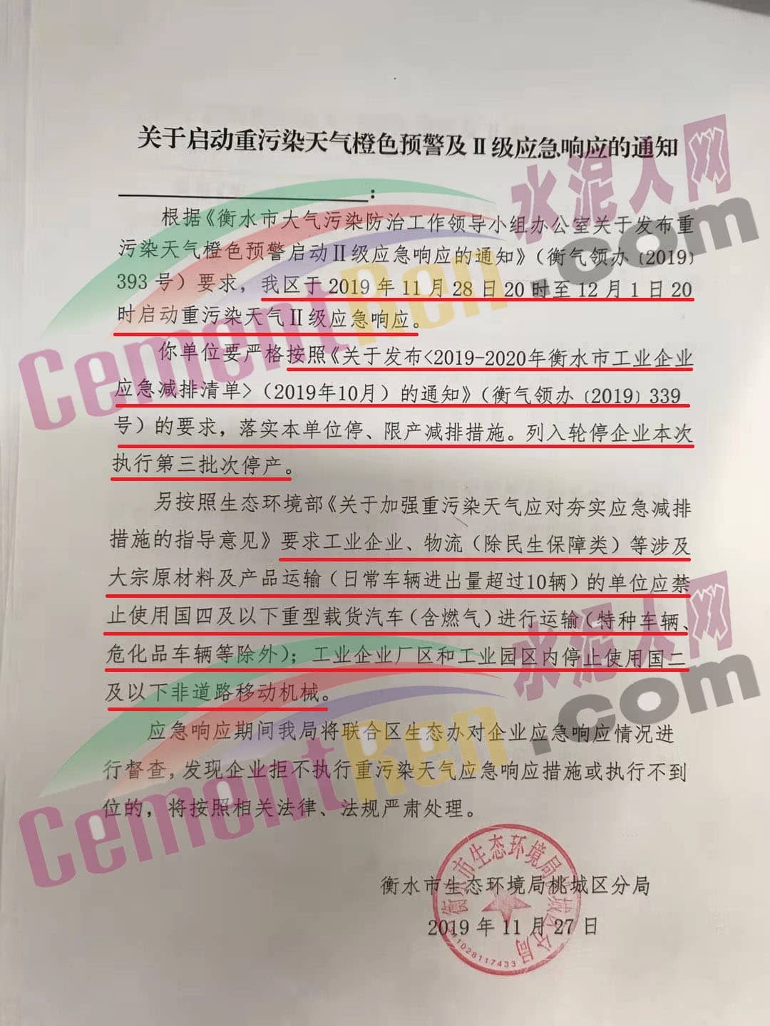 強制性污染減排措施要求工業(yè)企業(yè)嚴格執(zhí)行《關于發(fā)布〈2019-2020年衡水市工業(yè)企業(yè)應急減排清單〉(2019年10月)的通知》(衡氣領辦〔2019〕339號)的清單中橙色預警減排措施。施工工地、工業(yè)企業(yè)廠區(qū)和工業(yè)園區(qū)內禁止使用國二及以下的非道路移動機械(除清潔能源和緊急檢修作業(yè))、不達標的非道路移動機械,建筑垃圾和渣土運輸車、砂石運輸車輛禁止上路行駛。按照生態(tài)環(huán)境部《關于加強重污染天氣應對夯實應急減排措施的指導意見》要求工業(yè)企業(yè)、物流(除民生保障類)等涉及大宗原材料及產品運輸(日常車輛進出量超過10輛)的單位應禁止使用國四及以下重型載貨汽車(含燃氣)進行運輸(特種車輛、?;奋囕v等除外)。