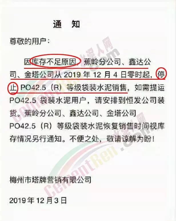 昨日(12月3日),梅州市塔牌營銷有限公司發(fā)布通知稱,因庫存不足原因,焦嶺分公司、鑫達公司、金塔公司從今日(12月4日)零時起停止PO42.5(R)等級袋裝水泥銷售,如需提運PO42.5(R)袋裝水泥用戶,請安排到恒發(fā)公司裝貨。焦嶺分公司、鑫達公司、金塔公司PO42.5(R)袋裝水泥恢復銷售時間視庫存情況另行通知。