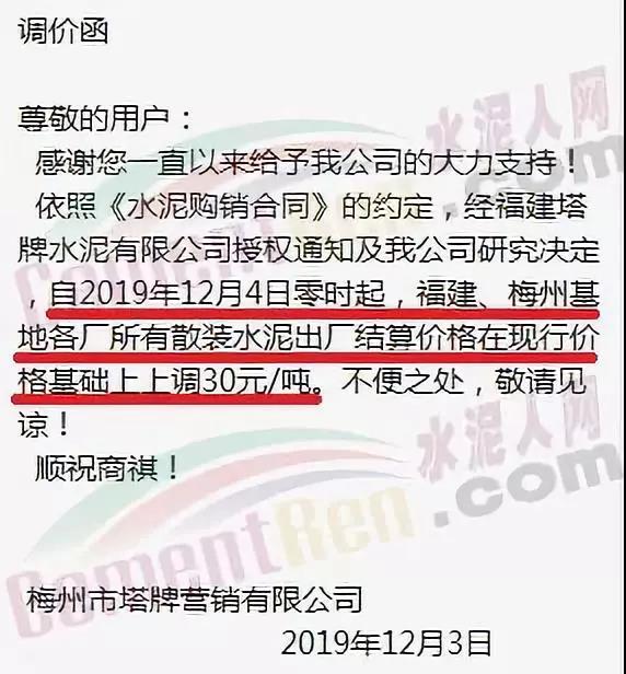 同期,梅州市塔牌營銷有限公司還發(fā)調價函稱自2019年12月4日零時起,福建、梅州基地各廠所有散裝水泥出廠結算價格在現(xiàn)行價格基礎上上調30元/噸。