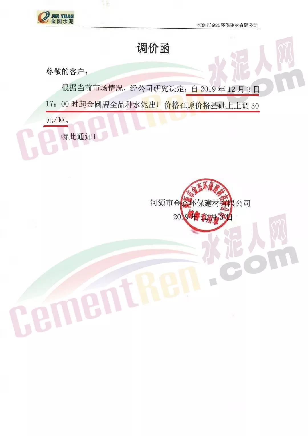 河源市金杰環(huán)保建材有限公司12月3日發(fā)布了調價函稱,根據當前市場情況,經公司研究決定,自2019年12月3日17:00時起金圓牌全品種水泥出廠價格在原基礎上上調30元/噸。