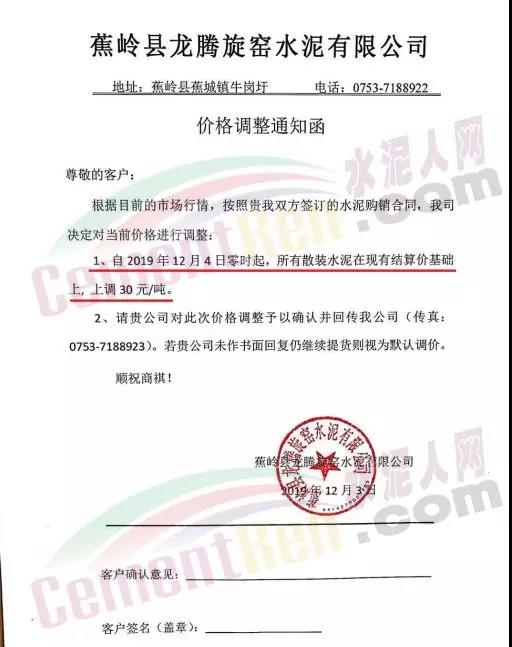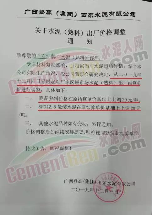 廣西登高(集團)田東水泥有限公司也發(fā)布調價通知稱,收原材料緊缺影響,并根據當前水泥市場行情,結合實際生產情況,經董事會研究決定,從2019年12月4日0時起對廣東區(qū)域市場(熟料)進行調整,商品熟料價格在原結算單價基礎上上調20元/噸,SP042.5散裝水泥在原結算單價基礎上上調20元/噸,其他水泥品種如有變動,另行通知。