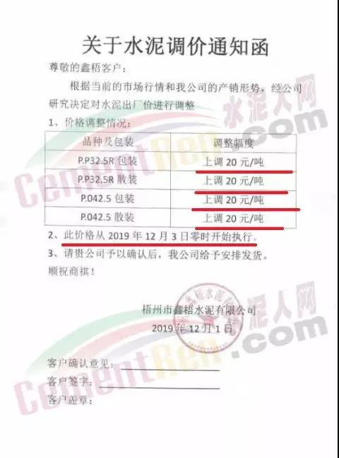 根據當前市場形勢及產銷存實際情況,經公司研究決定,定于2019年12月3日00:00起對袋裝、散裝各品種水泥價格上調20元/噸。