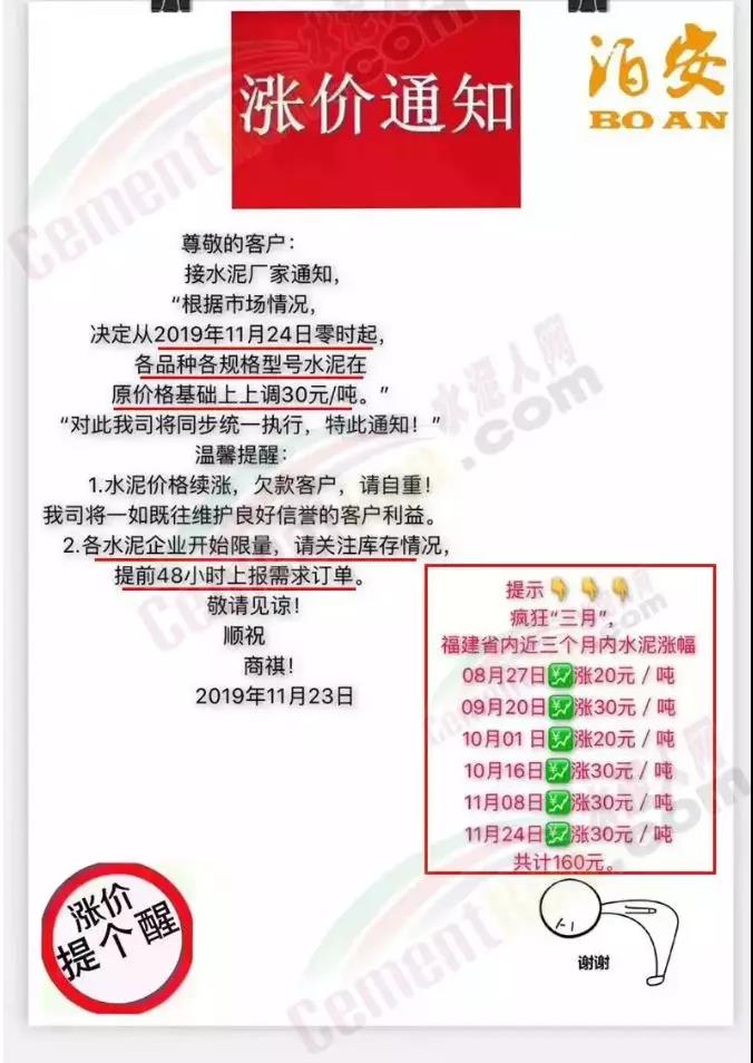 11月23日,福建泊安水泥的漲價(jià)通知稱,根據(jù)市情況從11月24日零時(shí)起,各品種各規(guī)格水泥在原價(jià)格基礎(chǔ)上上調(diào)30元/噸。自此,福建省內(nèi)近三個(gè)月內(nèi)水水泥水泥連漲六波,累計(jì)漲價(jià)達(dá)160元/噸。