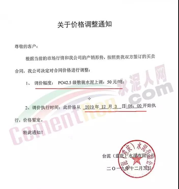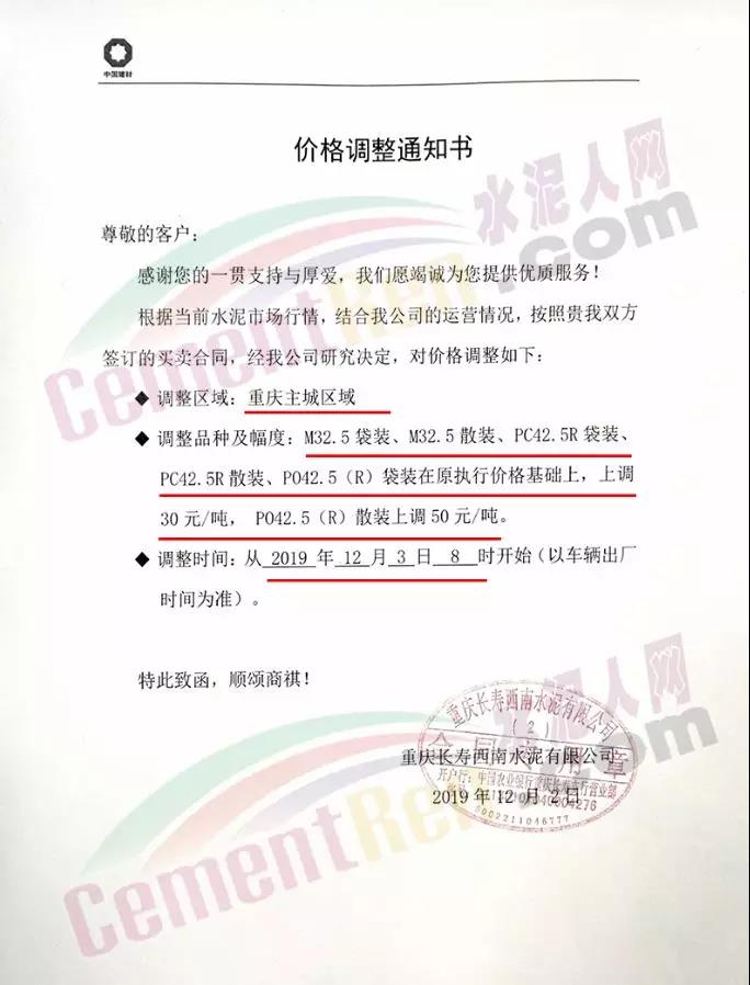 根據(jù)目前市場(chǎng)行情,經(jīng)公司研究決定,自2019年12月5日零時(shí)起我司發(fā)往各區(qū)域水泥出廠單價(jià)在原有基礎(chǔ)上上調(diào)30元/噸。