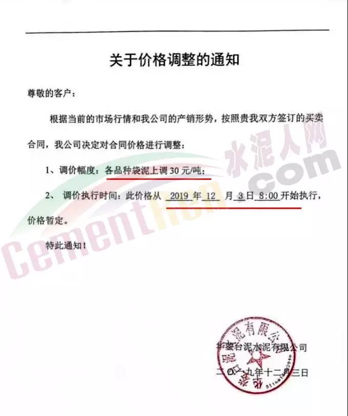 感謝您一直以來(lái)對(duì)我司的大力支持、根據(jù)目前市場(chǎng)行情,經(jīng)公司研究決定,自2019年12月5日6時(shí)起,我司發(fā)往各區(qū)域的全部品牌各規(guī)格袋、散裝水泥的出廠價(jià)格上調(diào)30元/噸。