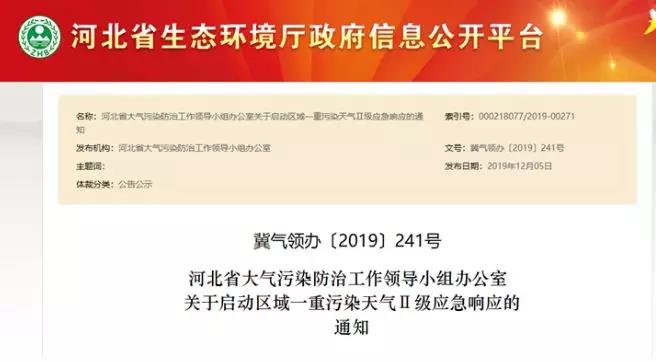 河北省大氣污染防治工作領(lǐng)導(dǎo)小組辦公室發(fā)通知要求石家莊、保定、衡水、邢臺、邯鄲、定州、辛集于12月7日12時至12月10日12時發(fā)布重污染天氣橙色預(yù)警,啟動Ⅱ級應(yīng)急響應(yīng)。