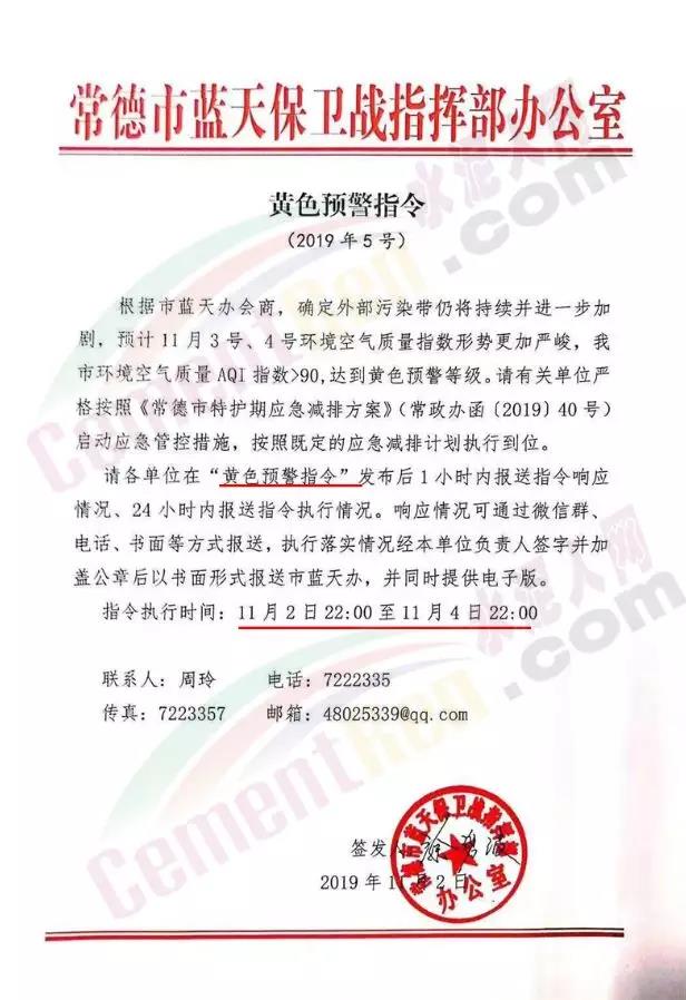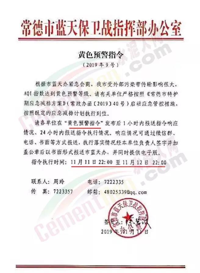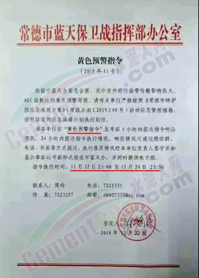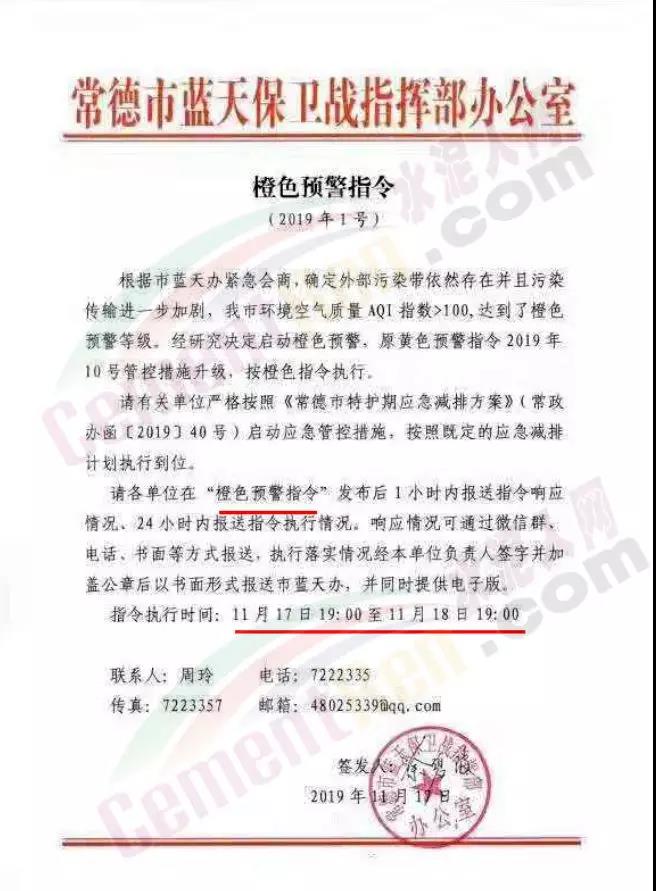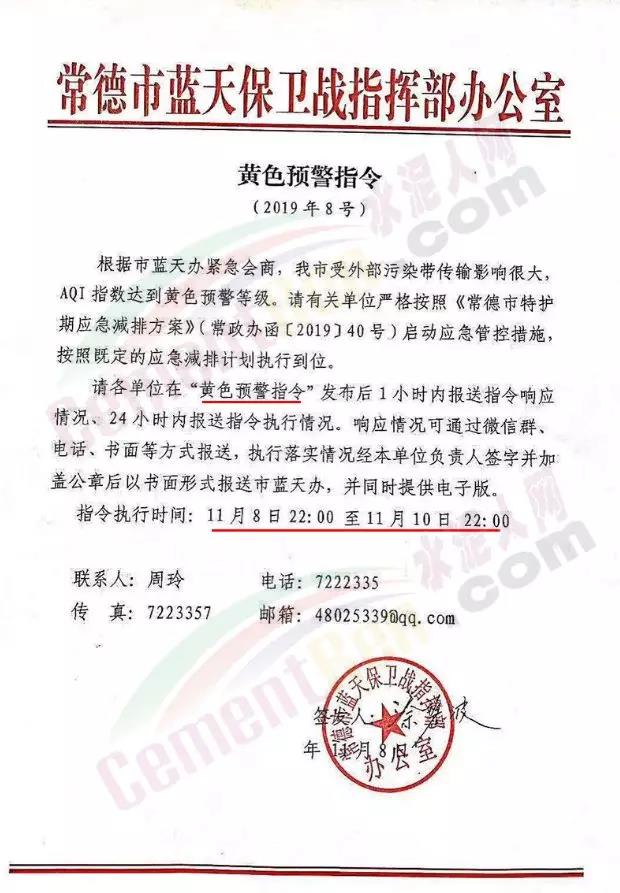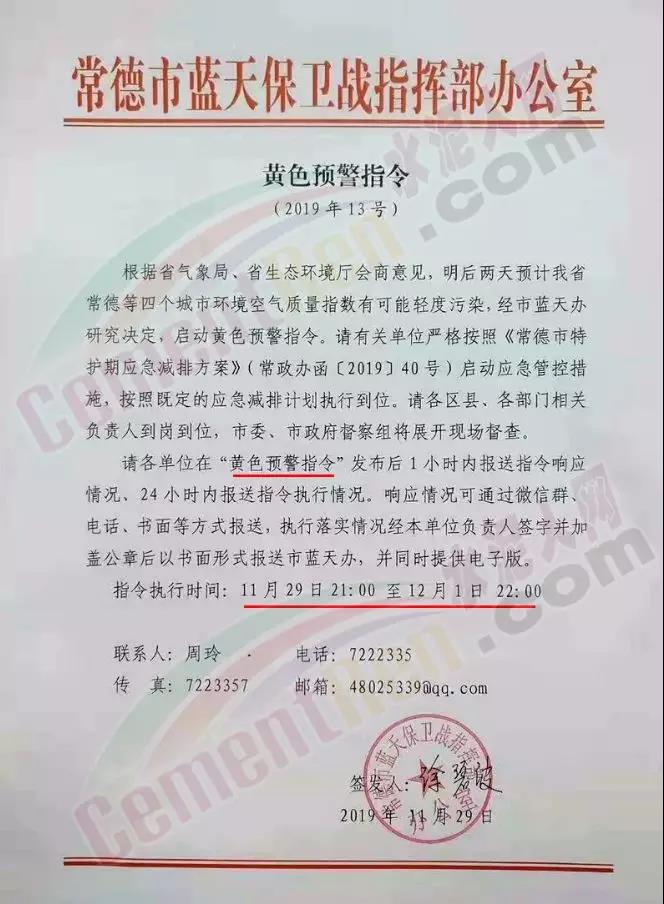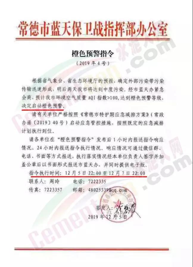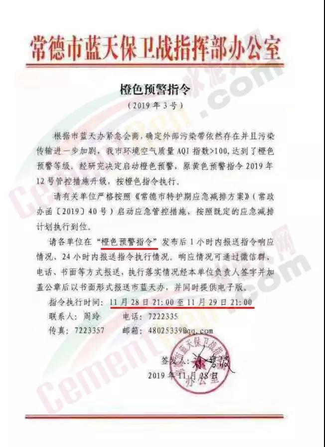 通常重污染天氣橙色以及上預(yù)警天氣要求水泥企業(yè)窯磨全停。類似的臨停在水泥生產(chǎn)企業(yè)集中的區(qū)域時有發(fā)生。據(jù)了解湖南常德市藍天保衛(wèi)戰(zhàn)指揮部辦公室自11月以來連發(fā)九次預(yù)警指令,要求有關(guān)單位啟動應(yīng)急管控措施,并按照既定的應(yīng)急減排計劃執(zhí)行到位。預(yù)警指令詳情如下: