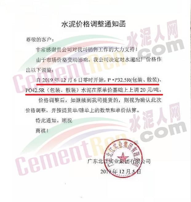 日前,廣東北江實(shí)業(yè)集團(tuán)有限公司發(fā)調(diào)價(jià)通知稱(chēng),由于市場(chǎng)價(jià)格變動(dòng)影響,公司決定 對(duì)水泥出廠價(jià)格做出調(diào)整。自12月6日零時(shí)開(kāi)始P.P32.5R(包、散裝)、PO42.5R(包裝、散裝)水泥在原單價(jià)基礎(chǔ)上上調(diào)20元/噸。