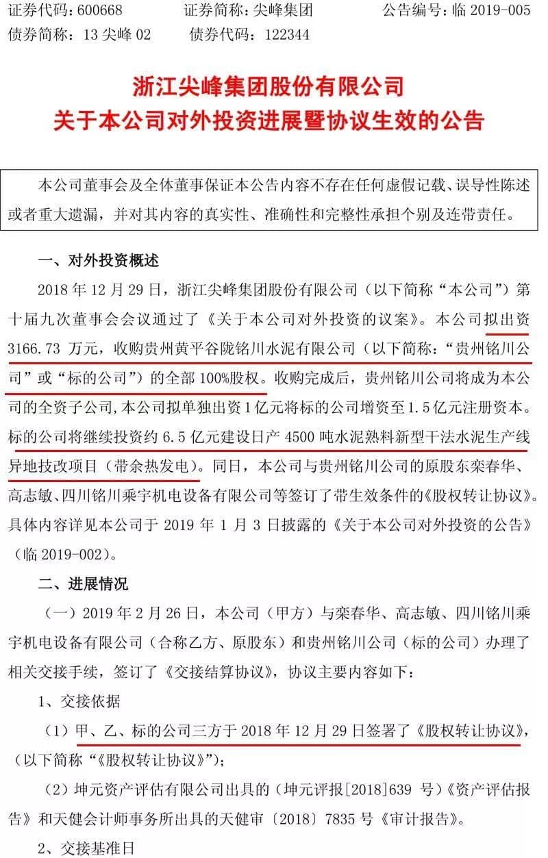 據(jù)了解,這條生產(chǎn)線是浙江尖峰集團(tuán)股份有限公司出資3166.73萬(wàn)元收購(gòu)的貴州黃平谷隴銘川水泥有限公司(貴州銘川公司)。收購(gòu)?fù)瓿珊?,貴州銘川公司成為尖峰的全資子公司,并由尖峰擬單獨(dú)出資1億元將其注冊(cè)資本增資至1.5億元,又投資約6.5億元建設(shè)日產(chǎn)4500噸水泥熟料新型干法水泥生產(chǎn)線異地技改項(xiàng)目(帶余熱發(fā)電)。今年2月28日,浙江尖峰集團(tuán)股份有限公司《關(guān)于本公司對(duì)外投資進(jìn)展暨協(xié)議生效的公告》中披露了該收購(gòu)的進(jìn)展情況。截止公告日,原股東所持標(biāo)的公司股份已全部過(guò)戶(hù)至本公司名下并完成了工商變更登記手續(xù),尖峰集團(tuán)已持有貴州銘川公司100%股權(quán)。
