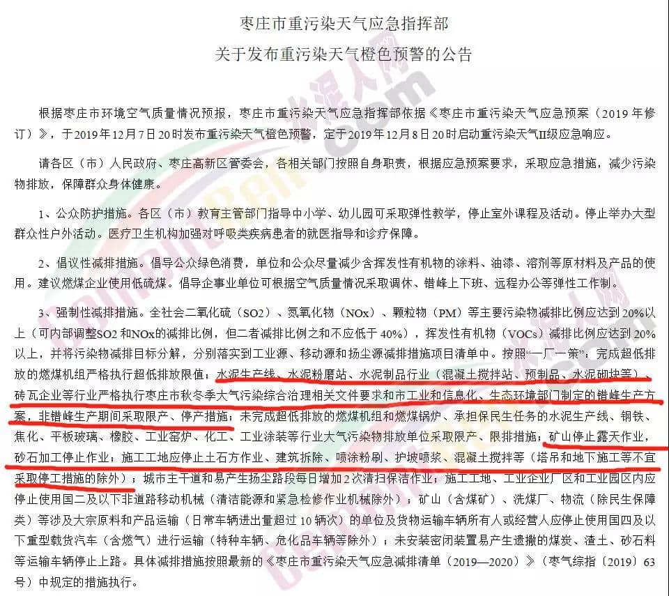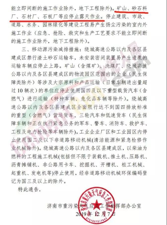 淄博市發(fā)布《重污染天氣橙色預(yù)警,啟動Ⅱ級應(yīng)急響應(yīng)的通知》,礦山、砂石料廠、石材廠、石板廠等停止露天作業(yè);施工工地停止土石方作業(yè)、建筑拆除、噴涂粉刷、護坡噴漿、混凝土攪拌及澆筑等;