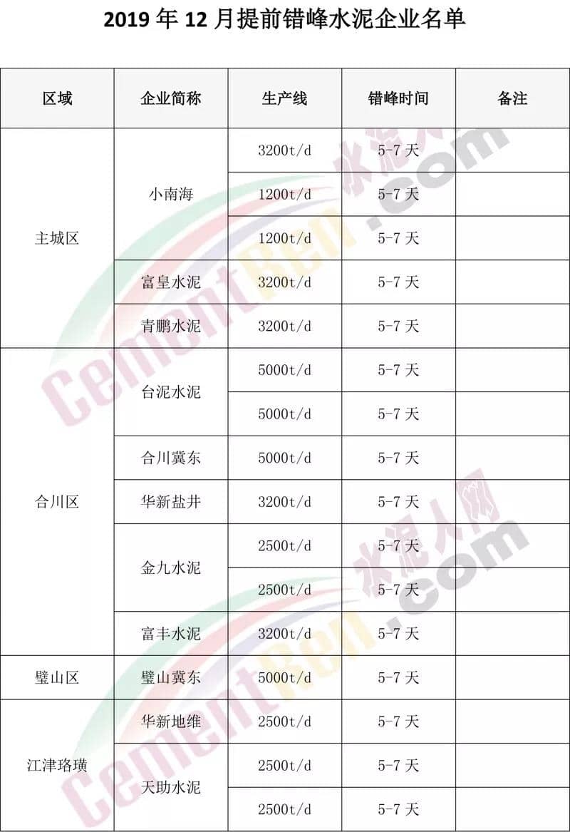 日前,重慶市水泥協(xié)會(huì)發(fā)布《重慶水泥行業(yè) 部分區(qū)域提前錯(cuò)峰的通知》(重水協(xié)【2019】30號文件)稱:為認(rèn)真貫徹市經(jīng)信委和市生態(tài)環(huán)境局聯(lián)合下發(fā)的《關(guān)于印發(fā)重慶市水泥行業(yè)錯(cuò)峰生產(chǎn)工作方案(2018-2020 年)的通知》(渝經(jīng)信法[2018]43號)文件精神,同時(shí)按照重慶市大氣污染防治攻堅(jiān)戰(zhàn)指揮部《關(guān)于啟動(dòng) 2019年第十二次空氣污染應(yīng)對工作預(yù)警函》的要求,將對主城區(qū)、璧山區(qū)、合川區(qū)、江津珞璜地區(qū)實(shí)行提前錯(cuò)峰。提前錯(cuò)峰區(qū)域及企業(yè):主城區(qū)、璧山區(qū)、合川區(qū)、江津珞璜地區(qū)所有全能生產(chǎn)線。