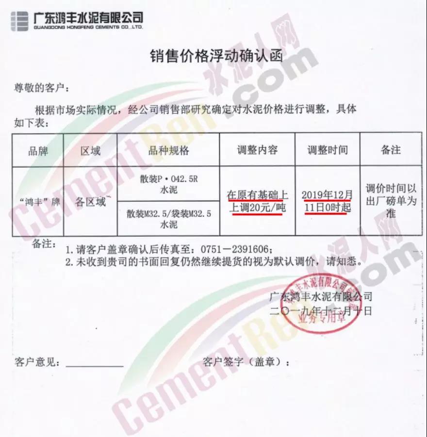 您好!根據當前市場形勢,本公司定于 2019年 12月 11日 8:00時起對各品種袋、散裝水泥價格上調20元/噸。