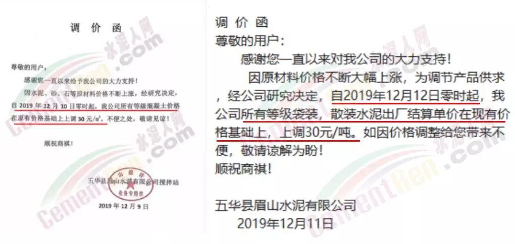 12月11日五華縣眉山水泥有限公司發(fā)調價函稱,因原材料價格不斷大幅上漲,為調節(jié)產品供求,經公司研究決定,自2019年12月12日零時起,公司所有等級袋裝,散裝水泥出廠結算單價在現有價格基礎上,上調30元/噸。