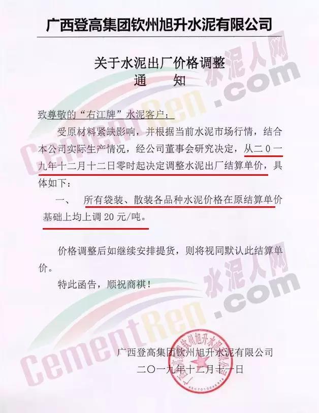 因廠內水泥庫存持續(xù)低位,我司決定于2019年12月10日00:00起,對興業(yè)的全品項散裝水泥出廠價格統(tǒng)一上調20元/噸。對貴港、桂平、平南、橫縣全品項袋泥、散泥上漲20元/噸。溫馨提示: 價格調整后,如繼續(xù)安排車輛到我司提貨,視為確認此次價格調整!順祝商祺!