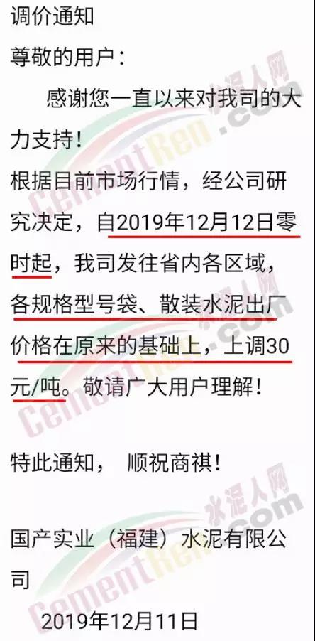 根據近期市場行情變化,我公司決定于2019年12月12日起,所有品種散裝、袋裝水泥出庫價在原有基礎上調30元/噸。順祝商祺!【福建鼎日實業(yè)有限公司】
