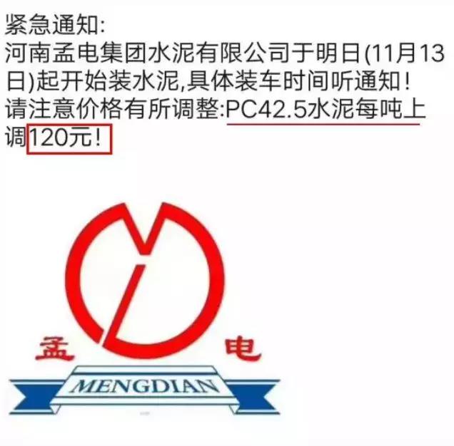 11月12日河南孟電集團水泥有限公司發(fā)布緊急通知稱:自11月13日起,PC42.5水泥每噸上調120元/噸,孟電水泥一鳴驚人,再次創(chuàng)下了近年水泥行業(yè)單次水泥價格上調幅最高的記錄。
