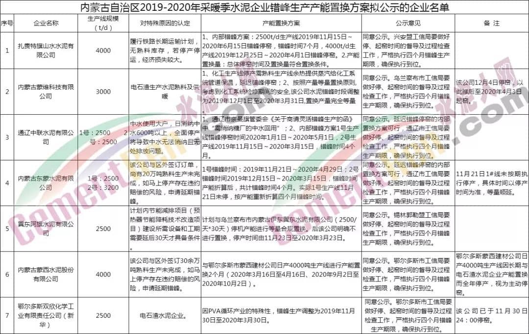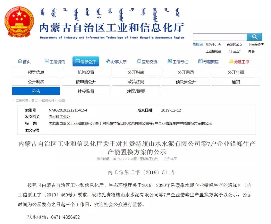 12月12日,內(nèi)蒙古自治區(qū)工業(yè)和信息化廳《內(nèi)蒙古自治區(qū)工業(yè)和信息化廳關(guān)于對(duì)扎賚特旗山水水泥有限公司等7戶(hù)企業(yè)錯(cuò)峰生產(chǎn)產(chǎn)能置換方案的公示》。