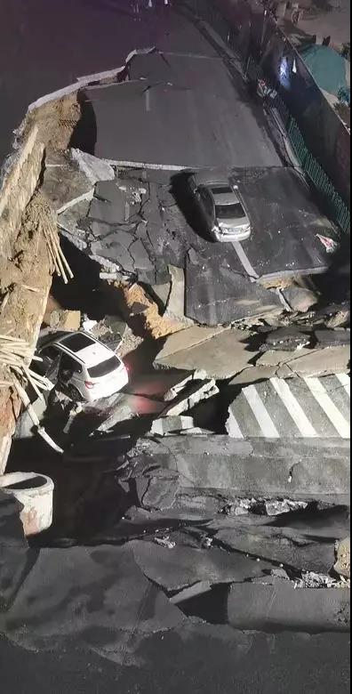 兩輛小車正好跌落在塌陷處