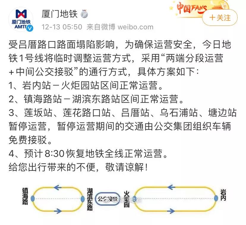 關于此次呂厝地陷導致水管破裂的事故,2019年12日23時50分左右,廈門日報從廈門水務集團獲悉,該集團已通過雙回路的另外一路管道供水,市區(qū)水壓已經逐步恢復。截至13日1時,各項措施正在推進中,正組織專家對事故原因進行調查。今天5:50,@廈門地鐵 再次發(fā)布消息,受呂厝路口路面塌陷影響,廈門地鐵1號線臨時調整運營方式,蓮坂站、蓮花路口站、呂厝站、烏石浦站、塘邊站暫停運營,暫停運營期間的交通由公交集團組織車輛免費接駁。預計8:30恢復地鐵全線正常運營。
