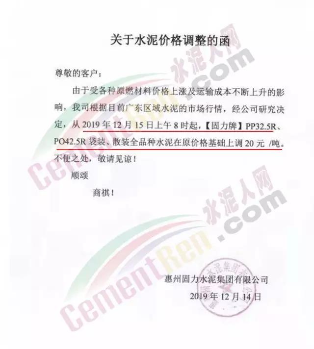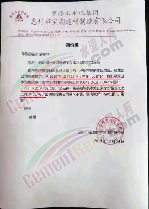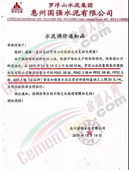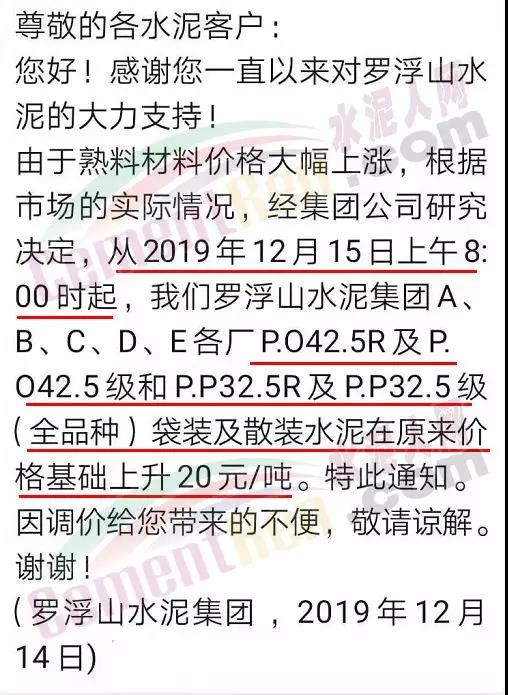 日前羅浮山水泥集團(tuán)通知稱(chēng)由于熟料價(jià)格大幅上漲,根據(jù)市場(chǎng)情況,經(jīng)集團(tuán)公司研究決定從今日(15日)上午8時(shí)起,羅浮山水泥集團(tuán)A、 B、C、D、E各廠P.O42.5R及PO42.5級(jí)和P.P32.5及P.P32.5級(jí)(全品種)袋裝和散裝水泥在原來(lái)價(jià)格基礎(chǔ)上升20元/噸。
