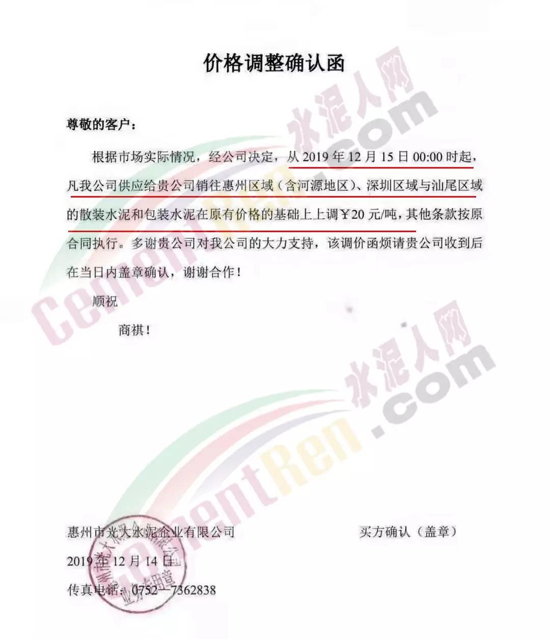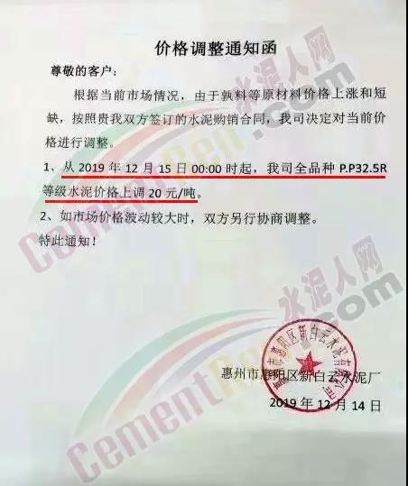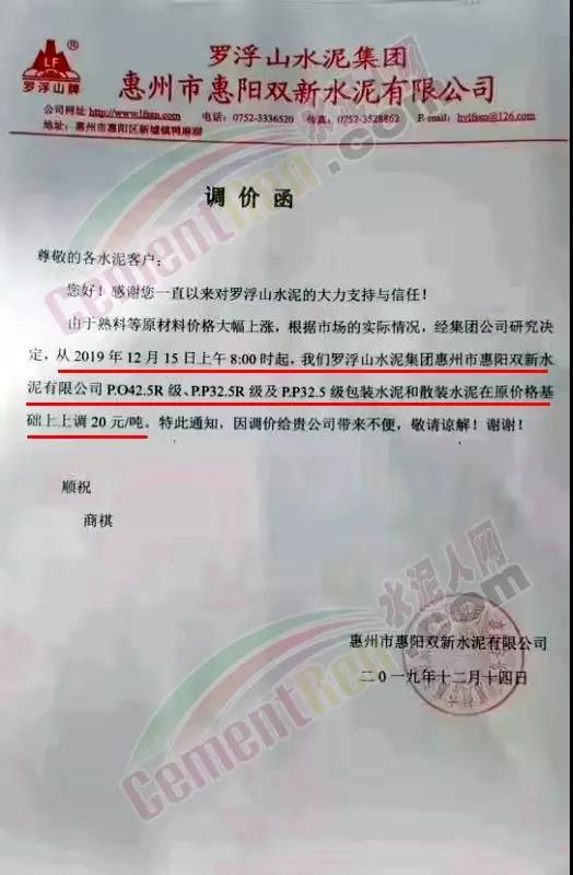 羅浮山水泥集團(tuán)惠州市惠陽(yáng)雙新水泥有限公司調(diào)價(jià)函稱(chēng)由于熟料等原材料價(jià)格大幅上漲,根據(jù)市場(chǎng)實(shí)際情況,經(jīng)集團(tuán)公司研究決定各標(biāo)號(hào)水泥包裝和散裝水泥在原價(jià)基礎(chǔ)上上調(diào)20元/噸。
