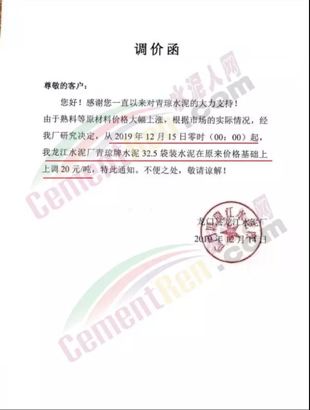龍門(mén)縣龍江水泥廠調(diào)價(jià)函稱(chēng),由于熟料等原材料價(jià)格大幅上漲,根據(jù)市場(chǎng)的實(shí)際情況,經(jīng)研究決定自今日(15日)零時(shí)起,龍江水泥廠青瓊牌水泥32.5袋裝在原價(jià)基礎(chǔ)上上調(diào)20元/噸。