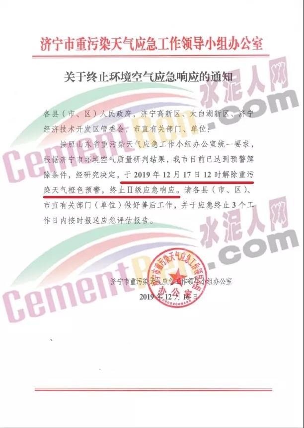 同期,山東省濟(jì)寧市重污染天氣應(yīng)急工作領(lǐng)導(dǎo)小組辦公室發(fā)布了《關(guān)于終止環(huán)境空氣應(yīng)急響應(yīng)的通知》稱,按照山東省重污染天氣應(yīng)急工作小組辦公室統(tǒng)一要求,根據(jù)濟(jì)寧市環(huán)境空氣質(zhì)量研判結(jié)果,濟(jì)寧市目前已達(dá)到預(yù)警解除條件,經(jīng)研究決定,于2019年12月17日12時(shí)解除重污染天氣橙色預(yù)警,終止二級應(yīng)急響應(yīng)。