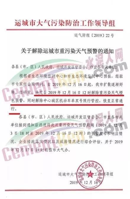 12月16日,山西省運(yùn)城市大氣污染防治工作領(lǐng)導(dǎo)組發(fā)布通知稱,根據(jù)山西省生態(tài)環(huán)境監(jiān)測中心和市生態(tài)環(huán)境監(jiān)測中心預(yù)報(bào),經(jīng)運(yùn)城市專家組會(huì)商研判,自2019年12月16日起,運(yùn)城市擴(kuò)散逐漸好轉(zhuǎn),經(jīng)研究,決定自2019年12月16日12時(shí)解除重污染天氣橙色預(yù)警。
