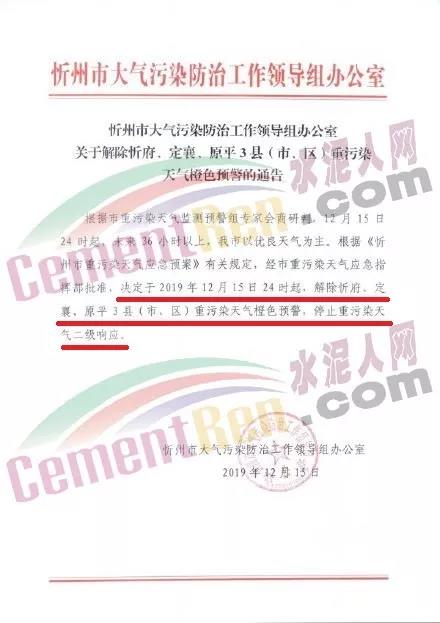 12月15日,山西省忻州市大氣污染防治工作領(lǐng)導(dǎo)組辦公室發(fā)布了《關(guān)于解除忻府、定襄、原平3縣(市、區(qū))重污染天氣橙色預(yù)警的通告》稱,根據(jù)市重污染天氣監(jiān)測預(yù)警組專家會(huì)商研判,12月15日24時(shí)起,未來36小時(shí)以上,忻州市以優(yōu)良天氣為主,根據(jù)《忻州市重污染天氣應(yīng)急預(yù)案》有關(guān)規(guī)定,經(jīng)忻州市重污染天氣應(yīng)急指揮部批準(zhǔn),決定于2019年12月15日24時(shí)起,解除忻府、定襄、原平3縣(市、區(qū))重污染天氣橙色預(yù)警。