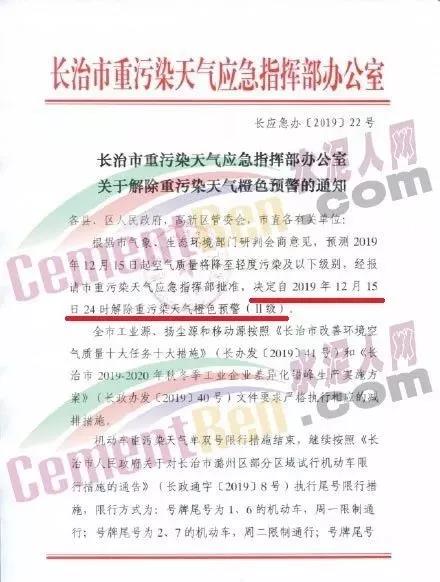 同期,山西長治市重污染天氣應(yīng)急指揮部辦公室發(fā)布了《關(guān)于解除重污染天氣橙色預(yù)警的通知》稱,根據(jù)市氣象、生態(tài)環(huán)境部門研判會(huì)商意見,預(yù)測2019年12月15日起空氣質(zhì)量將降至輕度污染及以下級別,經(jīng)長治市重污染天氣應(yīng)急指揮部批準(zhǔn),決定自2019年12月15日24時(shí)解除重污染天氣橙色預(yù)警(二級)。