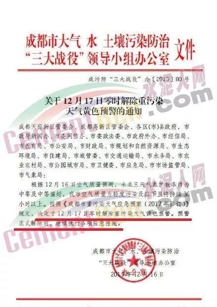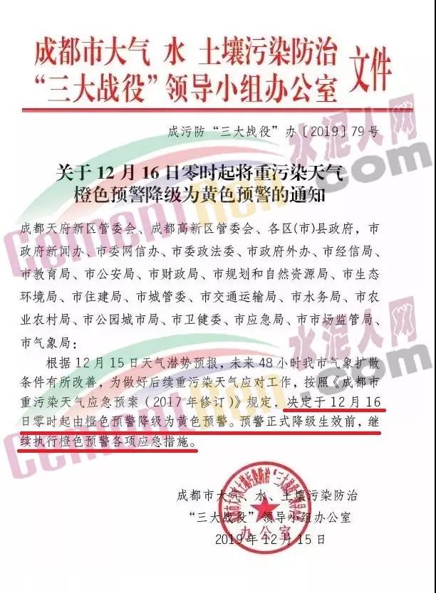 15日,成都市大氣、水、土壤污染防治“三大戰(zhàn)役”領(lǐng)導(dǎo)小組辦公室曾發(fā)布通知稱自12月16日零時(shí)起由橙色預(yù)警降級為黃色預(yù)警。