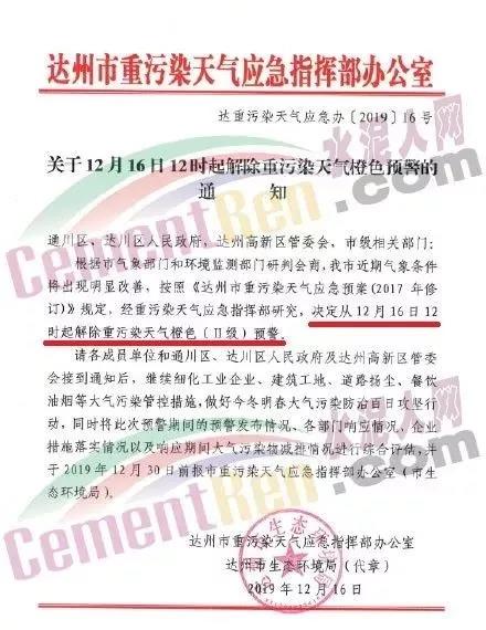 12月16日,四川達(dá)州市重污染天氣應(yīng)急指揮部辦公室、達(dá)州市生態(tài)環(huán)境局聯(lián)合發(fā)布了《關(guān)于12月16日12時(shí)起解除重污染天氣橙色預(yù)警的通知》稱,根據(jù)市氣象部門和環(huán)境監(jiān)測部門研判會(huì)商,達(dá)州市近期氣象條件將出現(xiàn)明顯改善,按照《達(dá)州市重污染天氣應(yīng)急預(yù)案(2017)年修訂》規(guī)定,經(jīng)重污染天氣應(yīng)急指揮部研究,決定從12月16日12時(shí)解除重污染天氣橙色(二級)預(yù)警。