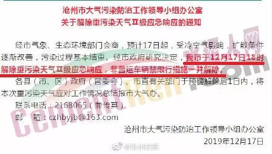 同期,滄州市大氣污染防治工作領(lǐng)導(dǎo)小組辦公室發(fā)布了《關(guān)于解除重污染天氣Ⅱ級應(yīng)急響應(yīng)的通知》稱,經(jīng)市氣象、生態(tài)環(huán)境部門會商,預(yù)計17日起,受冷空氣影響,擴(kuò)散條件逐漸改善,污染過程基本結(jié)束。經(jīng)市政府研究決定,滄州市于12月17日18時解除重污染天氣Ⅱ級應(yīng)急響應(yīng) ,非營運(yùn)車輛禁限行措施一并解除。各縣(市、區(qū))政府(管委會)、市直有關(guān)部門于預(yù)警解除后1日內(nèi),將本次重污染天氣應(yīng)對工作情況總結(jié)報市大氣辦。