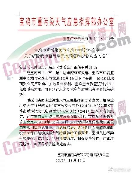 12月16日,寶雞市重污染天氣應(yīng)急指揮部辦公室發(fā)布了《關(guān)于解除重污染天氣預(yù)警和應(yīng)急響應(yīng)的通知》稱,寶雞市空氣質(zhì)量預(yù)計以良-輕度污染為主,而且預(yù)計未來5天工期質(zhì)量沒有明顯轉(zhuǎn)差趨勢,經(jīng)寶雞市重污染天氣應(yīng)急指揮部批準(zhǔn),市應(yīng)急指揮部辦公室決定從2019年12月16日16時起解除重污染天氣黃色預(yù)警。