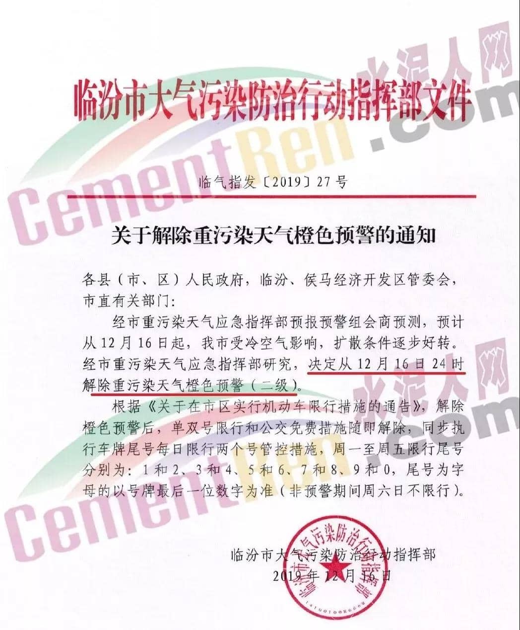 12月16日,臨汾市大氣污染防治行動指揮部發(fā)布了《關(guān)于解除重污染天氣橙色預(yù)警的通知》稱,經(jīng)臨汾經(jīng)市重污染天氣應(yīng)急指揮部預(yù)報預(yù)警組會商預(yù)測,預(yù)計從12月16日起,我市受冷空氣影響,擴(kuò)散條件逐步好轉(zhuǎn)。經(jīng)市重污染天氣應(yīng)急指揮部研究,決定從12月16日24時解除重污染天氣橙色預(yù)警(二級)。