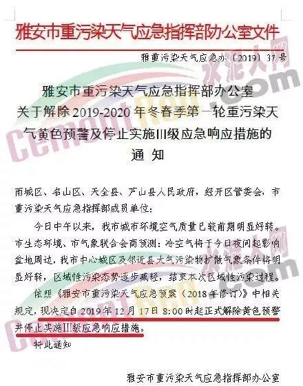 12月16日,雅安市重污染天氣應(yīng)急指揮部辦公室發(fā)布了《關(guān)于解除重污染天氣黃色預(yù)警通知》稱,依照《雅安市重污染天氣應(yīng)急預(yù)案(2018年修訂)》中相關(guān)規(guī)定,現(xiàn)決定自2019年12月17日8:00時起正式解除黃色預(yù)警并停止實施Ⅲ級應(yīng)急響應(yīng)措施。