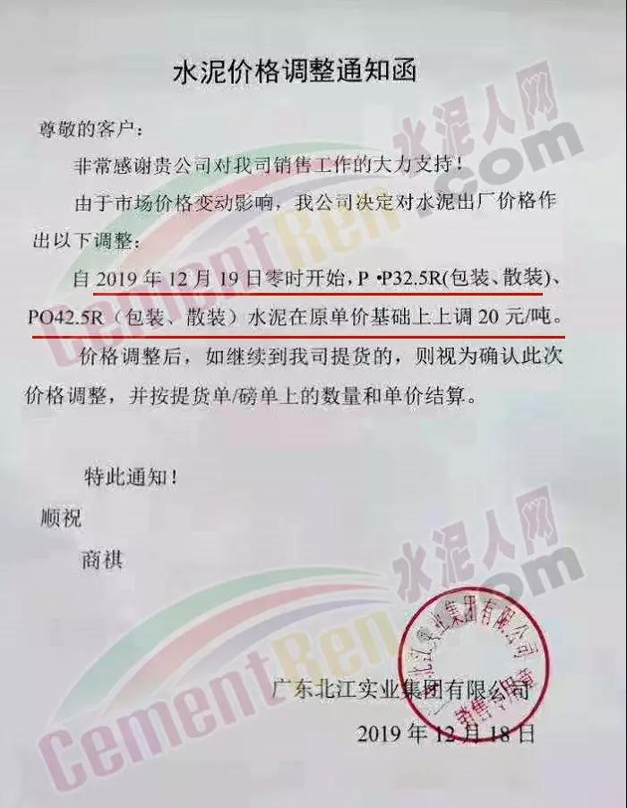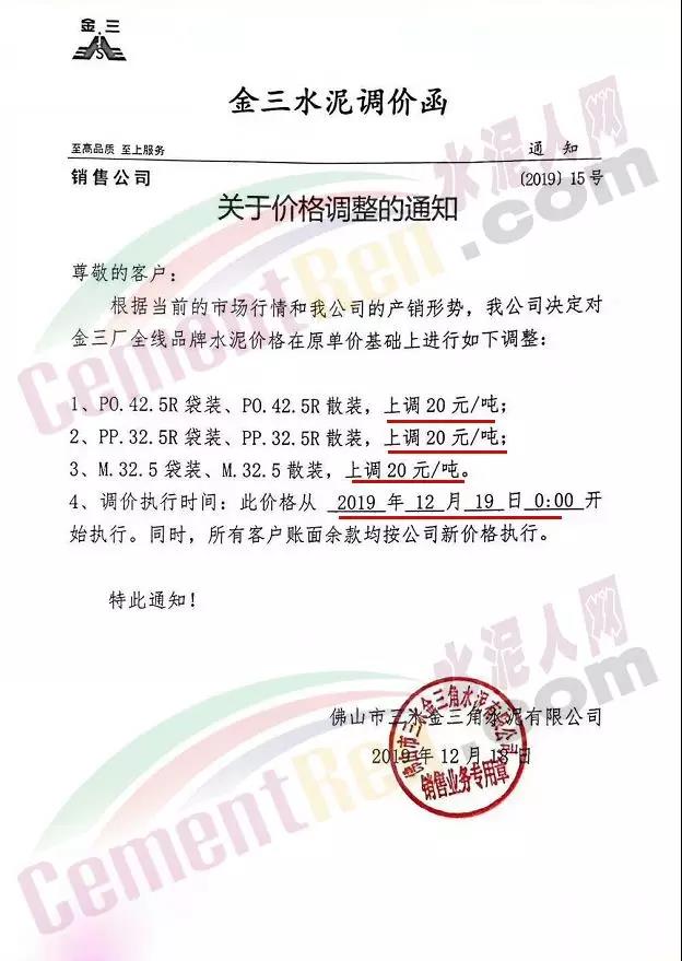 廣東區(qū)域,佛山金三水泥通知,根據(jù)當前的市場行情結(jié)合公司的產(chǎn)銷形勢,決定自今日(19日)0時起對金三廠全線品牌水泥在原單價基礎上上調(diào)20元/噸。