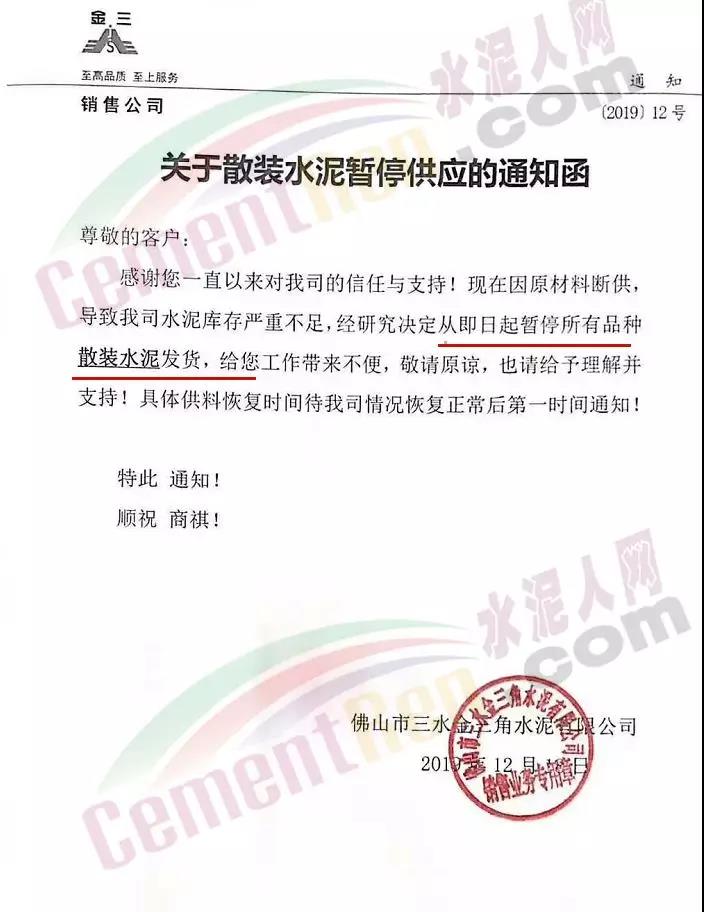 據(jù)了解,日前佛山市三水金三角水泥有限公司剛剛發(fā)布了散裝水泥停供通知。通知稱,因原材料斷供、導致公司水泥庫存嚴重不足,經(jīng)研究決定從即日起暫停所有品種散裝水泥。具體供料恢復時間等企業(yè)情況恢復正常后第一時間通知。