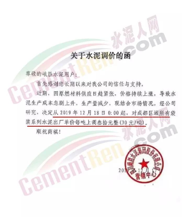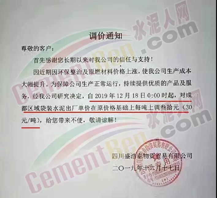 四川盛浩泰物資貿(mào)易有限公司調(diào)價通知稱,自12月18日零時起,對成都區(qū)域袋裝水泥出廠單價在原價格基礎上上調(diào)30元/噸。