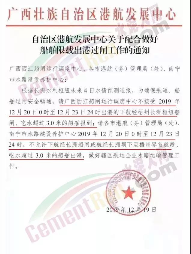 12月19日廣西壯族自治區(qū)港航發(fā)展中心發(fā)布《自治區(qū)港航發(fā)展中心關(guān)于配合做好船舶限載出港過閘工作的通知》稱:根據(jù)長洲水利樞紐未來4日水情預(yù)測通報,為確保航道、船舶過閘安全暢通,請廣西西江船閘運行調(diào)度中心不接受2019年12月20日0時至12月23日24時出港的下航經(jīng)梧州長洲樞紐船閘、吃水超過3.0米的船舶報到;請各市港航(務(wù))管理局(處)、南寧市水路建設(shè)養(yǎng)護中心2019年12月20日0時至12月23日24時,不允許下航經(jīng)長洲船閘或航經(jīng)長洲壩下至梧州界首航段、吃水超過3.0米的船舶出港,做好轄區(qū)航運企業(yè)水路運輸管理工作。