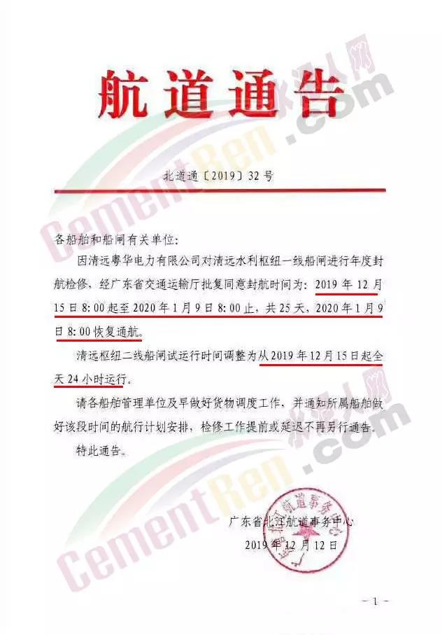 在這之前廣東省北江航道事務(wù)中心也發(fā)布第32號航道通告稱,因清遠(yuǎn)粵華電力有限公司對清遠(yuǎn)水利樞紐一線船閘進行年度封航檢修,經(jīng)廣東省交通運輸廳批復(fù)同意封航時間為2019年12月15日8時起至2020年1月9日8時止,共25天,1月9日8時恢復(fù)通航。