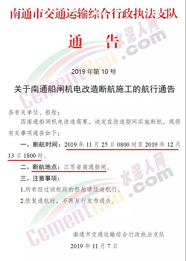 上個月南通市交通運輸綜合行政執(zhí)法支隊發(fā)布《關(guān)于南通船閘機電改造斷航施工的航行通告》(2019年第10號)稱因南通船閘機電改造需要,決定在改造期間實施斷航。斷航時間11月25日8時至12月13日18時。斷航地址為江蘇省南通船閘。要求所有經(jīng)過該航段的船舶繞道航行。