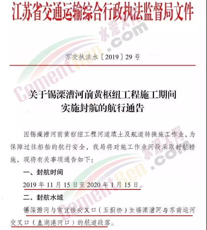 江蘇省交通運輸綜合行政執(zhí)法監(jiān)督局發(fā)布《關(guān)于錫溧漕河前黃樞紐工程施工期間實施封航的航行通告》(蘇交執(zhí)法水〔2019〕29 號)。錫溧漕河前黃樞紐工程河道填土及航道封航時間為2019 年 11 月 15 日至 2020 年 1 月 15 日。封航水域為錫溧漕河與常宜線交叉口(五洞橋)至錫溧漕河與蘇南運河交叉口(直湖港河口)的航道段落。封航期間途經(jīng)船舶必須從蕪申運河、丹金溧漕河、京杭運河繞行,同時禁止300噸以上、船寬7米以上的船舶通過武宜運河、老錫溧漕河(太滆運河)繞行。