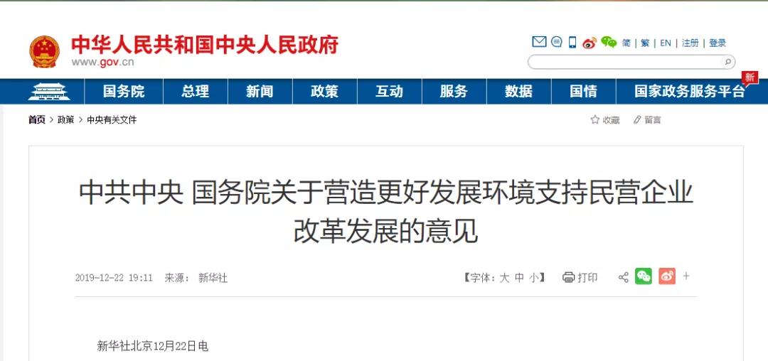 日前,中華人民共和國(guó)中央人民政府官網(wǎng)發(fā)布《中共中央 國(guó)務(wù)院關(guān)于營(yíng)造更好發(fā)展環(huán)境 支持民營(yíng)企業(yè)改革發(fā)展的意見》稱:改革開放40多年來,民營(yíng)企業(yè)在推動(dòng)發(fā)展、促進(jìn)創(chuàng)新、增加就業(yè)、改善民生和擴(kuò)大開放等方面發(fā)揮了不可替代的作用。民營(yíng)經(jīng)濟(jì)已經(jīng)成為我國(guó)公有制為主體多種所有制經(jīng)濟(jì)共同發(fā)展的重要組成部分。為進(jìn)一步激發(fā)民營(yíng)企業(yè)活力和創(chuàng)造力,充分發(fā)揮民營(yíng)經(jīng)濟(jì)在推進(jìn)供給側(cè)結(jié)構(gòu)性改革、推動(dòng)高質(zhì)量發(fā)展、建設(shè)現(xiàn)代化經(jīng)濟(jì)體系中的重要作用,現(xiàn)就營(yíng)造更好發(fā)展環(huán)境支持民營(yíng)企業(yè)改革發(fā)展提出如下意見。
