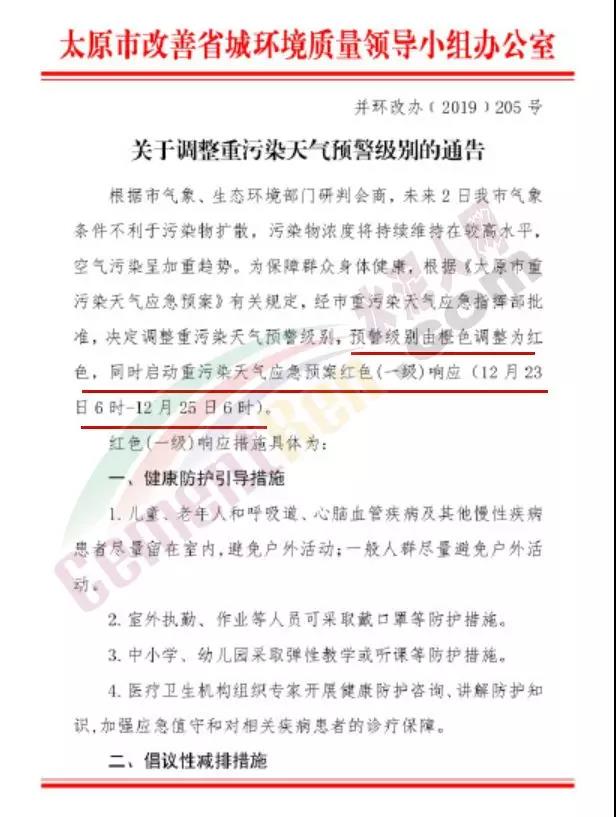 同日,太原市公安局關(guān)于發(fā)布重污染天氣臨時交通管理措施的通告稱根據(jù)太原市改善省城環(huán)境質(zhì)量領(lǐng)導(dǎo)小組《關(guān)于調(diào)整重污染天氣預(yù)警級別的通告》(并環(huán)改辦[2019]205號)和《太原市重污染天氣應(yīng)急預(yù)案》規(guī)定,接市重污染天氣應(yīng)急指揮部通知,決定調(diào)整重污染天氣預(yù)警級別,預(yù)警級別由橙色調(diào)整為紅色,同時啟動重污染天氣應(yīng)急預(yù)案紅色(一級)響應(yīng)(12月23日0時—12月25日0時)。為應(yīng)對空氣重污染、保護(hù)公眾健康,市政府決定,對在本市行政區(qū)域內(nèi)道路行駛的機(jī)動車(含臨時號牌車輛)采取臨時交通管理措施。
