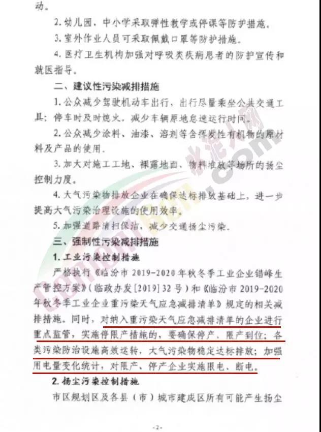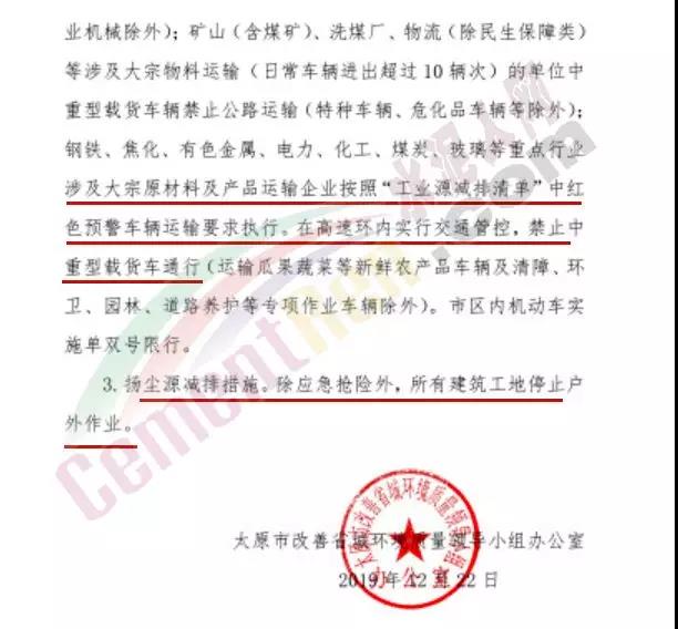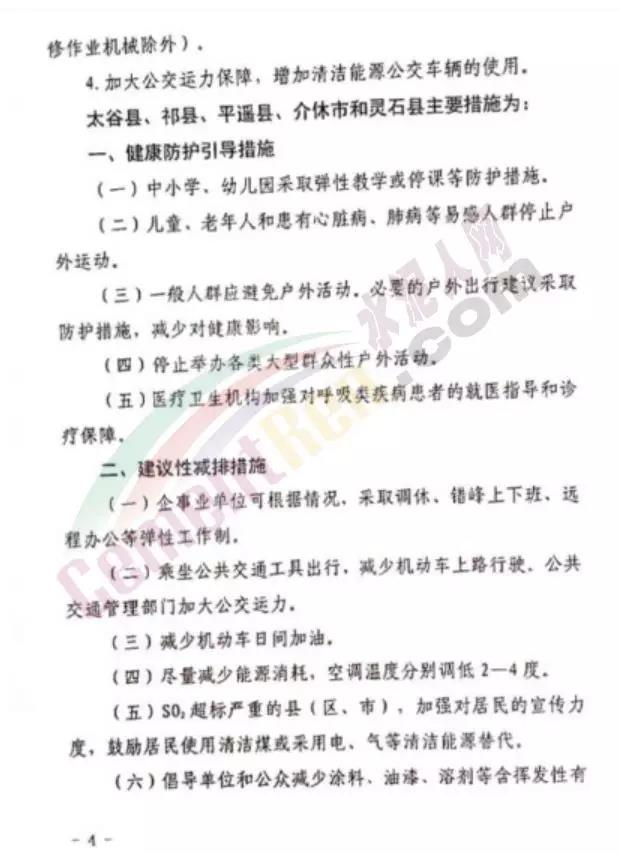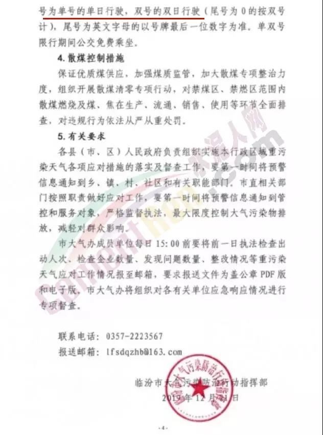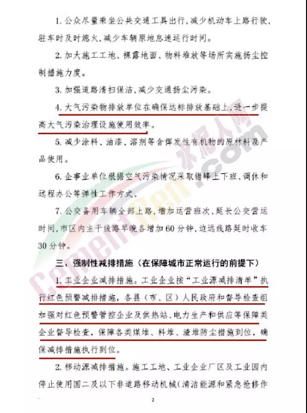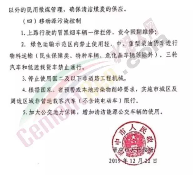 (一)工業(yè)源停限產(chǎn)措施。1、鋼鐵行業(yè)。承擔(dān)供暖任務(wù)的企業(yè):在橙色預(yù)警減排措施基礎(chǔ)上,燒結(jié)機(jī)、球團(tuán)裝備、石灰窯增加20%限產(chǎn)比例。不承擔(dān)供暖任務(wù)的企業(yè):績效評價等級為B級的,燒結(jié)機(jī)、球團(tuán)設(shè)備、石灰窯停產(chǎn)??冃гu價為C級的,燒結(jié)機(jī)、球團(tuán)設(shè)備、石灰窯停產(chǎn);高爐停產(chǎn)50%(含)以上。如預(yù)警響應(yīng)時間超過120小時,之后時段燒結(jié)機(jī)、球團(tuán)裝備停產(chǎn)50%以上(以生產(chǎn)線計算停產(chǎn)比例)。鋼鐵企業(yè)停限產(chǎn)計劃要明確到具體裝備,各縣(市、區(qū))政府將鋼鐵企業(yè)停限產(chǎn)計劃統(tǒng)一匯總后于12月23日10時前報市應(yīng)急管理局和市環(huán)保指揮中心備案。2、其他行業(yè)。嚴(yán)格按照《重污染天氣應(yīng)急工業(yè)源污染物減排清單》中“橙色預(yù)警減排措施”執(zhí)行。(二)移動源限行措施。1、施工工地、工業(yè)企業(yè)廠區(qū)和工業(yè)園區(qū)內(nèi)停止使用國二及以下非道路移動機(jī)械。2、市中心城區(qū)環(huán)城路以內(nèi)以及各縣(市)區(qū)城區(qū),每天7時至20時禁止大型貨車(含持有通行證)、三輪汽車、低速載貨汽車通行,禁止建筑垃圾和渣土運(yùn)輸車、砂石運(yùn)輸車輛上路行駛。3、礦山、洗煤廠、港口、物流(除民生保障類)等涉及大宗原料和產(chǎn)品運(yùn)輸(日常車輛進(jìn)出量超過10輛)的單位禁止使用國四及以下重型載貨汽車(含燃?xì)?進(jìn)行運(yùn)輸。4、工業(yè)企業(yè)移動源限行措施執(zhí)行《關(guān)于印送〈關(guān)于加強(qiáng)重污染天氣應(yīng)對夯實應(yīng)急減排措施的指導(dǎo)意見〉的函》(環(huán)辦大氣函〔2019〕648號)相關(guān)條款。5、12月23日至26日,每天7時至20時,全市黨政機(jī)關(guān)、事業(yè)單位、國有企業(yè)公務(wù)用車采取單雙號限行措施(含本地臨時牌照,不含外地車牌),單號單日通行,雙號雙日通行,尾號是字母的以最后一個數(shù)字為準(zhǔn)。(三)揚(yáng)塵源控制措施。1、礦山、沙石料廠、石材廠、石板廠等停止露天作業(yè);施工工地停止土石方作業(yè)、建筑拆除、噴涂粉刷、護(hù)坡噴漿、混凝土攪拌等;未安裝密閉裝置易產(chǎn)生遺撒的煤炭、渣土、砂石料等運(yùn)輸車輛停止上路。2、在常規(guī)作業(yè)基礎(chǔ)上,對城市主要干道增加機(jī)掃、吸掃等清潔頻次,但應(yīng)避開早、中、晚城市交通高峰期;主干道和易產(chǎn)生揚(yáng)塵路段應(yīng)增加機(jī)掃頻次。3、城市主城區(qū)、縣(市、區(qū))城區(qū)禁止燃放煙花爆竹和露天燒烤。
