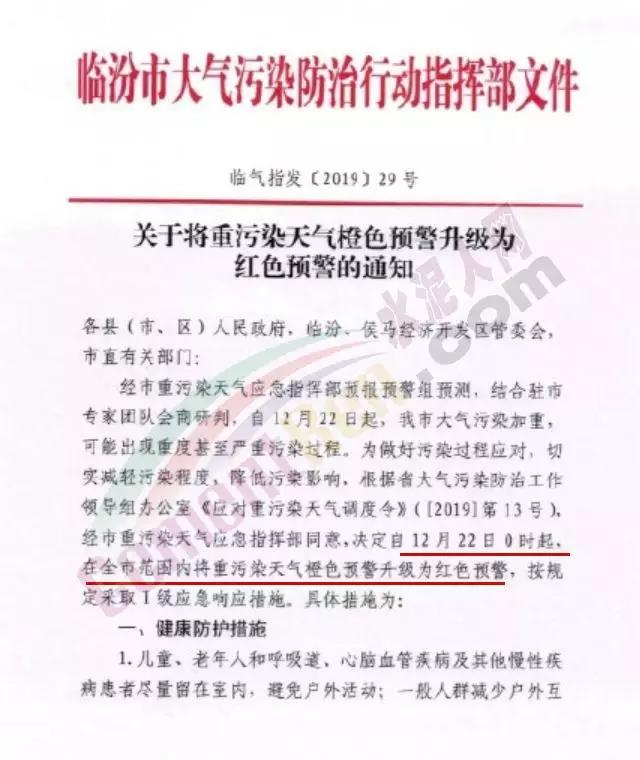 同一日,山西省生態(tài)環(huán)境廳通知,12月22日,山西省太原、臨汾、運(yùn)城大氣污染加重,可能出現(xiàn)重度甚至嚴(yán)重污染過程。為做好污染過程應(yīng)對,切實減輕污染程度,降低污染影響,3市分別調(diào)整重污染天氣預(yù)警級別,預(yù)警級別由橙色調(diào)整為紅色,同時啟動重污染天氣應(yīng)急預(yù)案紅色(一級)響應(yīng)。